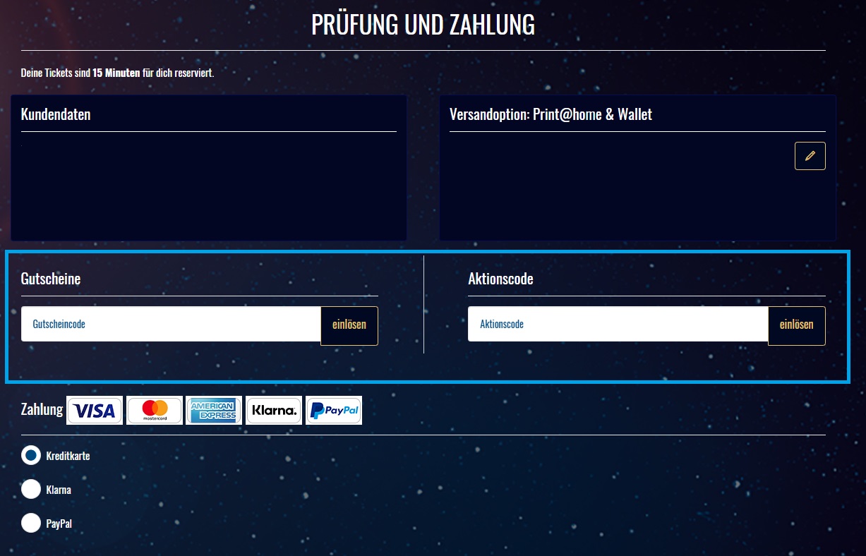 Nachdem du die Eintrittskarten in den Warenkorb gelegt hast und den Schritt zur Prüfung und Zahlung einleitest, hast du die Möglichkeit einen oder mehrere Gutschein einzulösen: