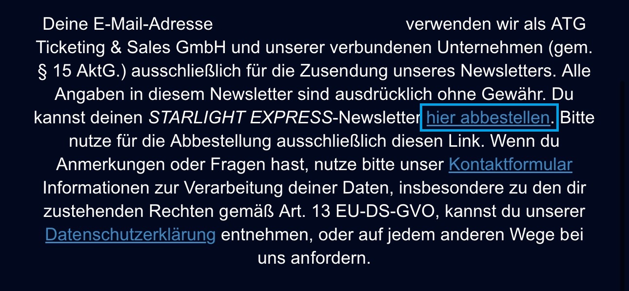 Falls du keinen Newsletter mehr erhalten möchtest, kannst du diesen jeweils direkt über die Fußzeile in dem betroffenen Newsletter abbestellen.